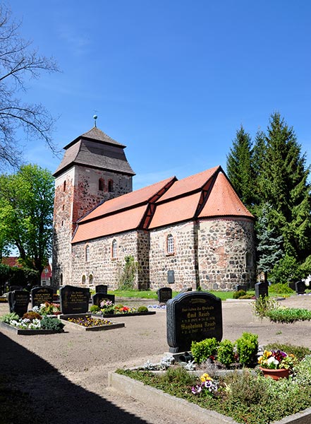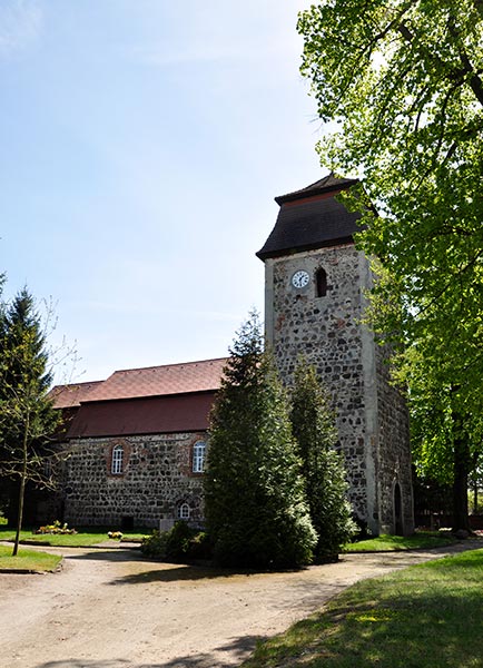 Die große Feldsteinkirche des Dorfes stammt bereits aus dem 12. Jahrhundert. Ihre Bauform wir bezeichnet als eine vollständige Anlage, bestehend aus Schiff, eingezogenem quadratischen Chor, halbrunder Apsis und einem hohen Querriegelturm, der das Schiff nach Westen bündig abschließt.