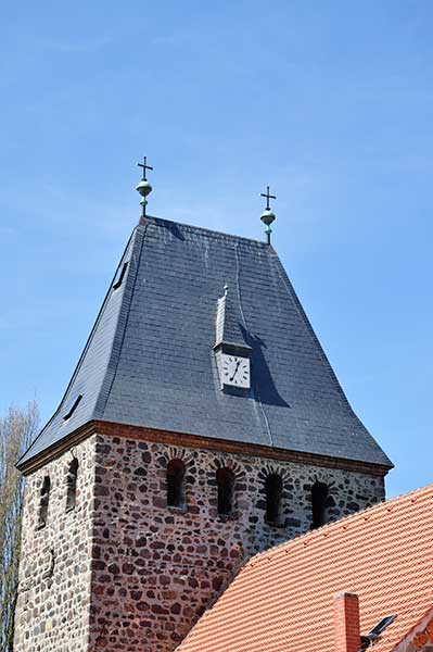 Die St.-Johannis-Kirche wurde um 1170 / 80 erbaut. Sie ist eine typische Dorfkirche in romanischer Staffelung, bestehend aus dem Kirchenschiff, einem eingezogenen Chor mit halbrunder Apsis und einem westlichen Querriegelturm. Der 28 Meter hohe, mächtige Turm mit steilem Walmdach wurde im Jahr 1958 nach einem teilweisen Einsturz zwei Jahre zuvor restauriert, wobei die Schallöffnungen auch wieder die Rundbogenform erhielten.