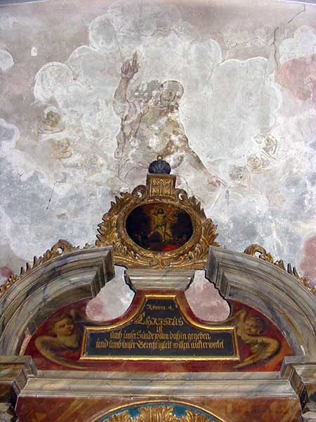 Aus derselben Zeit stammt auch die Inneneinrichtung. Die Bänke sind noch mit den Namen der damals wohnberechtigten Bürger versehen. Der prächtige Altaraufsatz von 1718 mit den Doppelsäulen an den Seiten hat die typische Aufteilung: eine bildliche Darstellung des Abendmahls ziert die Predella, die Kreuzigung das Altarblatt, die Auferstehung den Giebel. Die Kanzel auf gewundener Säule hat in den Feldern ebenfalls Gemälde, die die Evangelisten und an der Kanzeltür die Apostel Petrus und Paulus darstellen.