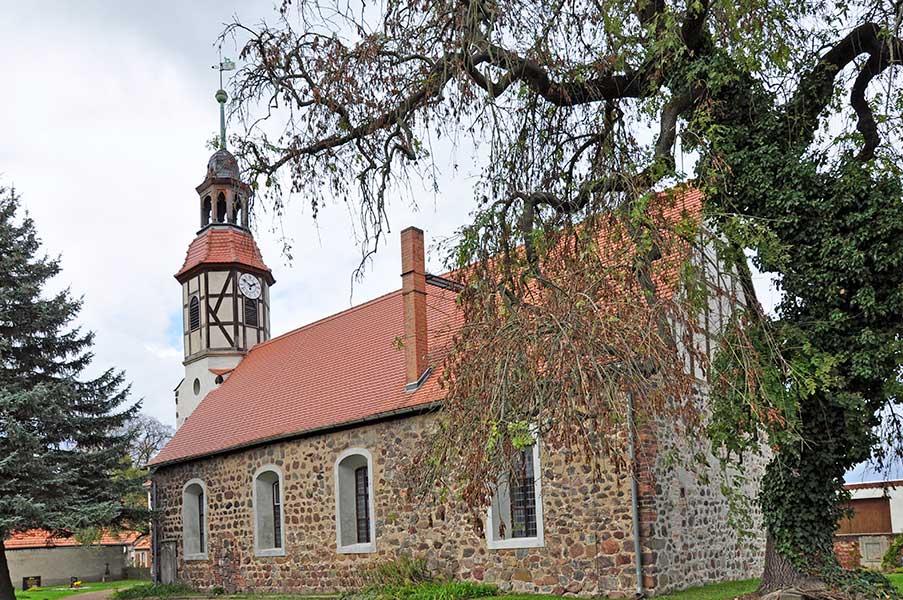Die spätromanische Feldsteinkirche erfuhr 1721 einen Umbau, bei dem möglicherweise das Schiff nach Osten verlängert wurde. Besonders auf der Nordseite bemerkt man die fast regellose Lage der Feldsteine im östlichen Teil. Der so entstandene neue Altarraum bekam einen geraden Abschluss, der Giebel wurde in Fachwerk ausgeführt und alle Fenster vergrößert. Eine weitere Erneuerung erfolgte 1914, bei der auch der Turm das jetzige Aussehen erhielt. Die Rundbogenportale auf der Nord- bzw. Südseite sind vermauert, aber in ihren Umrissen noch gut zu erkennen. Auf der Südseite blieb ein Sandsteinepitaph aus der Barockzeit erhalten. Der schlichte Kanzelaltar ist aus dem 18. Jahrhundert. Die Holztaufe im neoromanischen Stil bekam die Kirchengemeinde von der St. Petri-Kirche zu Senst.