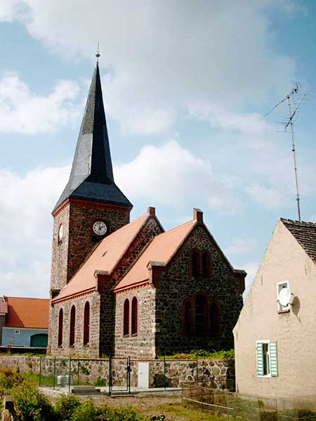 Die spätromanische Feldsteinkirche besteht aus dem Kirchenschiff mit einem eingezogenen Altarhaus ohne Apsis und hat einen quadratischen Westturm. Auf der Nordseite findet sich eine alte, vermauerte Rundbogentür (Priesterpforte), die 1893 im Rahmen der Gesamterneuerung der Kirche restauriert wurde. Am Schiff sind zwei ehemalige Rundbogenportale an der Nord- und Südseite in Konturen erkennbar. An der alten Zinkblechabdeckung des Turmes waren Inschriften aus dem Jahre 1664 eingraviert.
